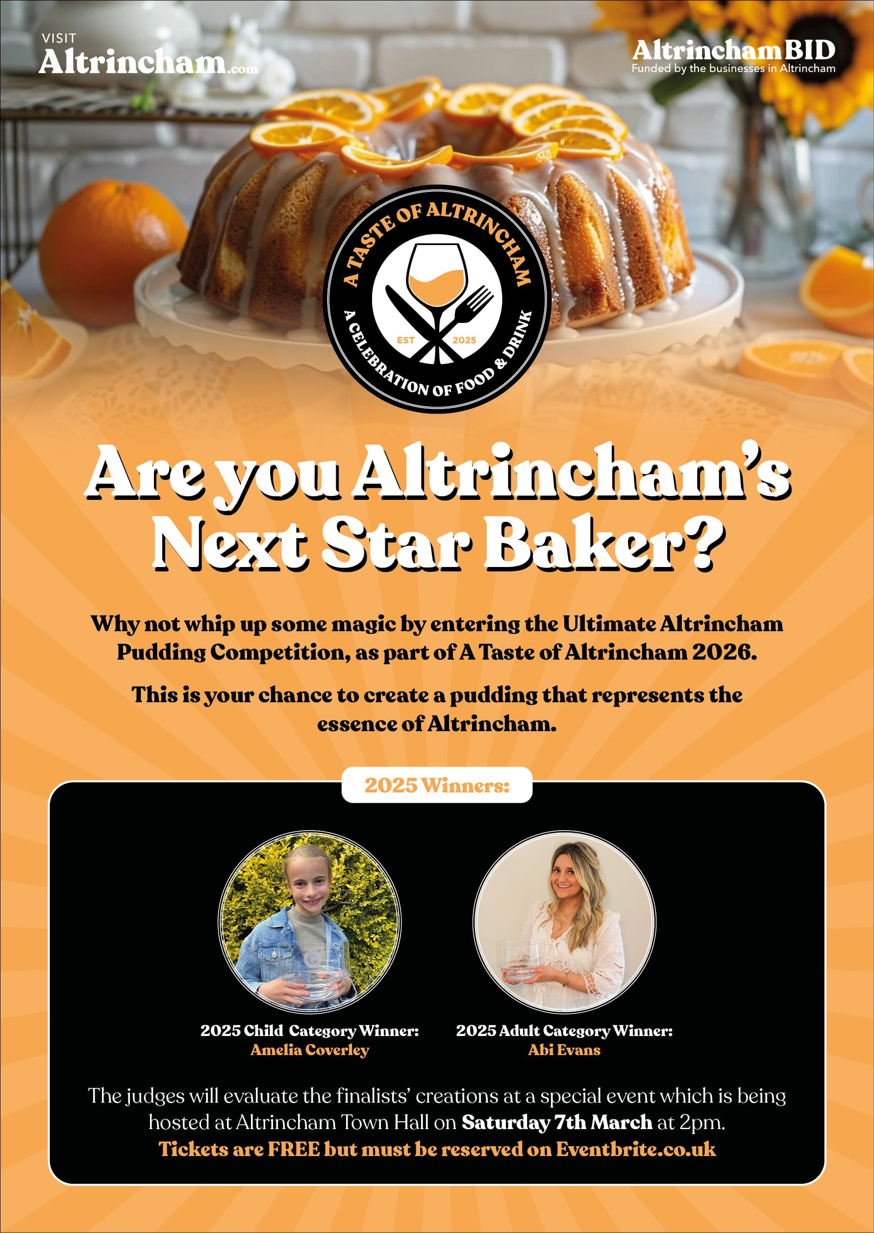 Finalists will present their creations to a panel of judges at a live event at Altrincham Town Hall on Saturday 7th March at 2pm. The overall winning dessert will be crowned the Official Altrincham Pudding 2026.