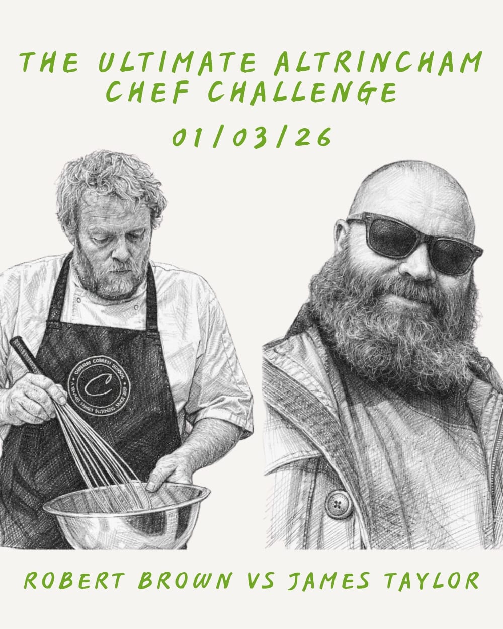 The event, taking place on Sunday 1st March at Altrincham Town Hall, will see chefs Robert Owen Brown and James Robert Taylor battle it out in a Ready Steady Cook-style competition using mystery ingredients chosen by local residents.